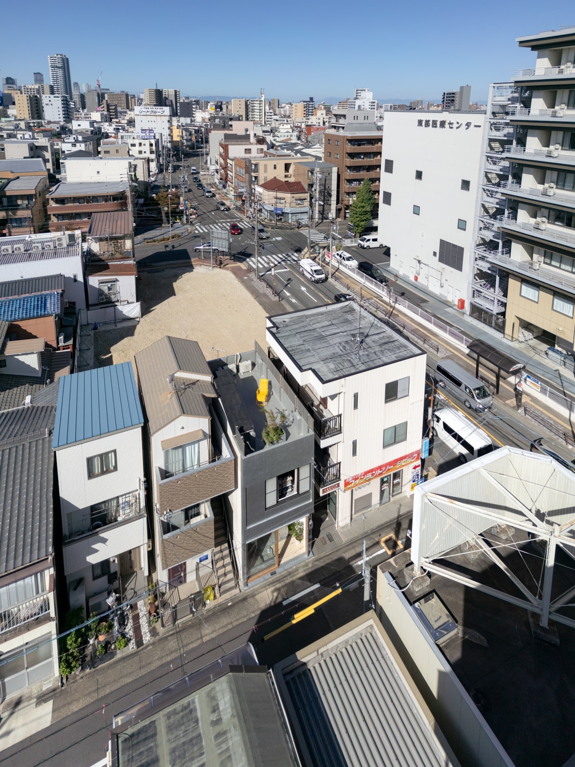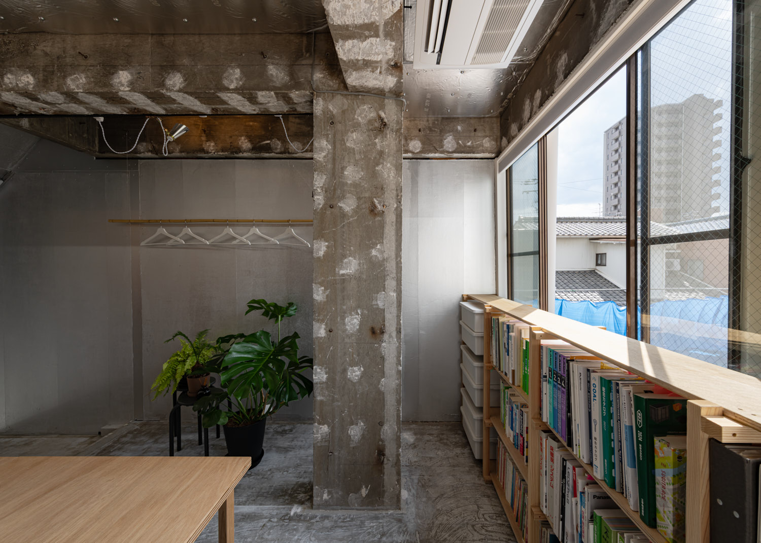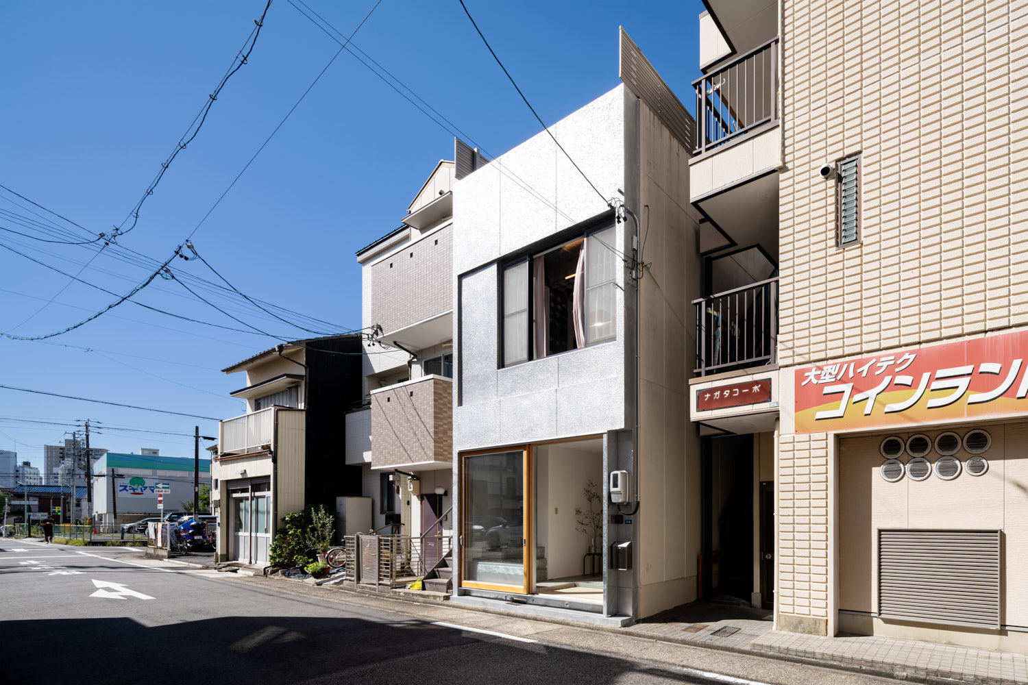 建物は1フロア9坪程度が敷地境界いっぱいに建てられていて、正面は幅員6mの道路に、裏手はコインパーキングをはさんで商店街通りに面する。RCラーメン構造の外壁はALC、鉄骨胴縁+サイディングによる乾式工法、コンクリートブロック積、一部RC造が混在する場当たり的なつくりになっている。1階通り側から階段を上がり2階裏手側の窓からは商店街通りや名古屋市の中心街方面に抜ける風景がよく感じられる。通りから街の風景へと続く体験を建築にすることにした。