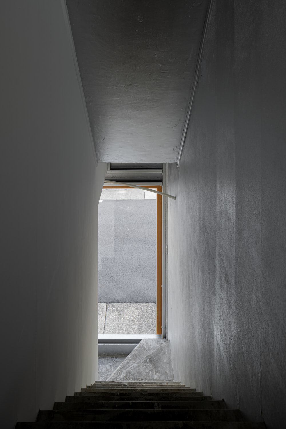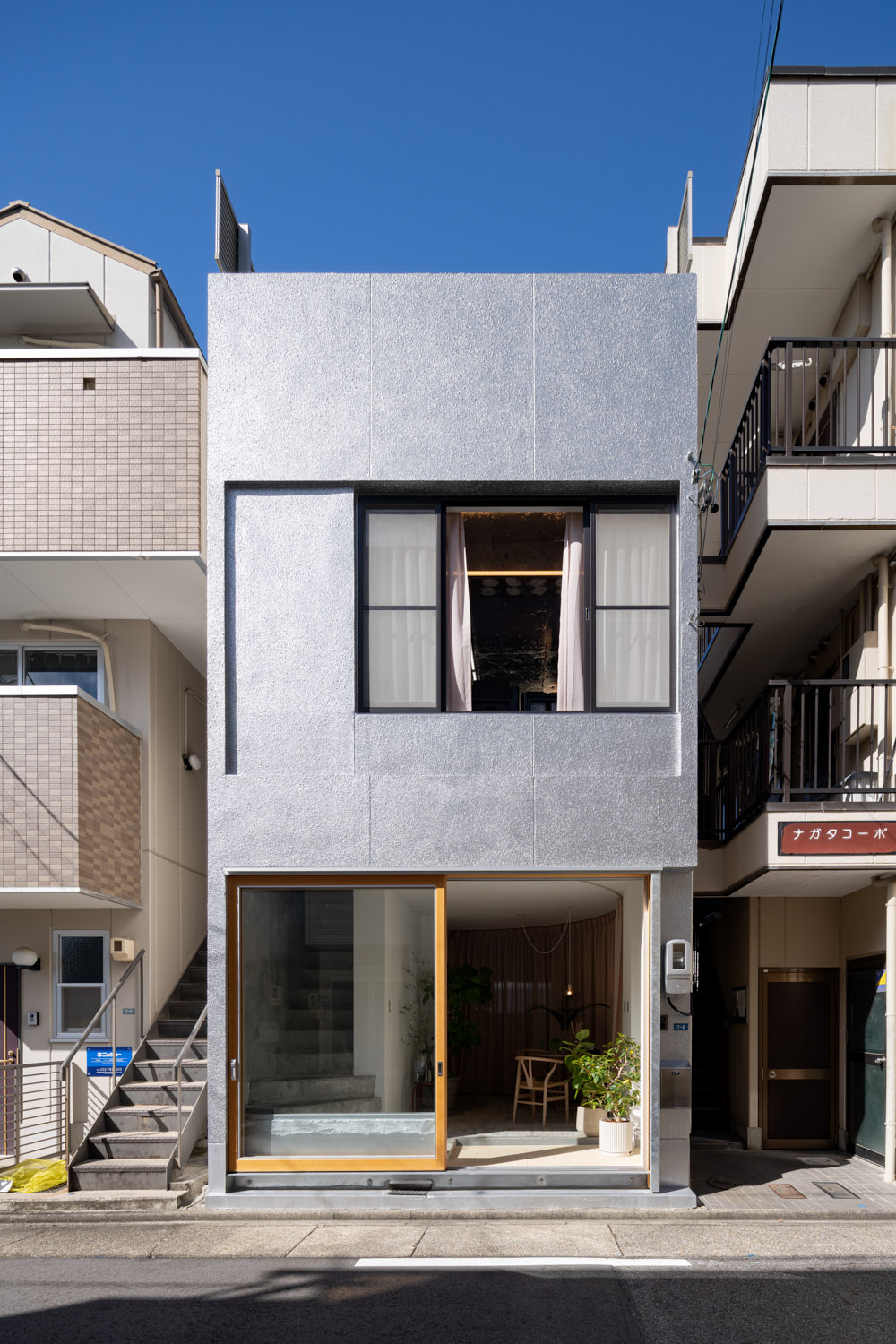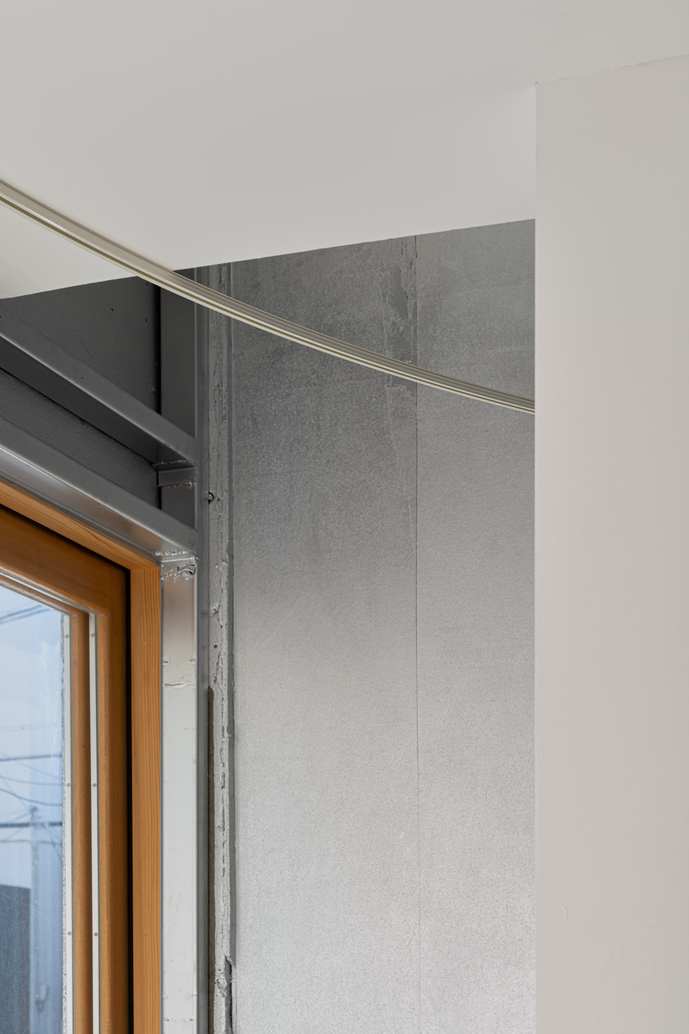 2階天井はアルミガラスクロス貼りグラスウールで断熱補強、2階と1階の通り際までつながる階段の壁・天井は、断熱材仕上と同じくアルミ層を形成するシルバー塗装で仕上げ、反射により両側の外部の光や街の雰囲気を室内に引き込んだ。さらに、階段からそのまま内部をめくって裏返すように、通りに面した外壁面もアルミ塗料で仕上げ、内部で行った操作をファサードにも連関させた。