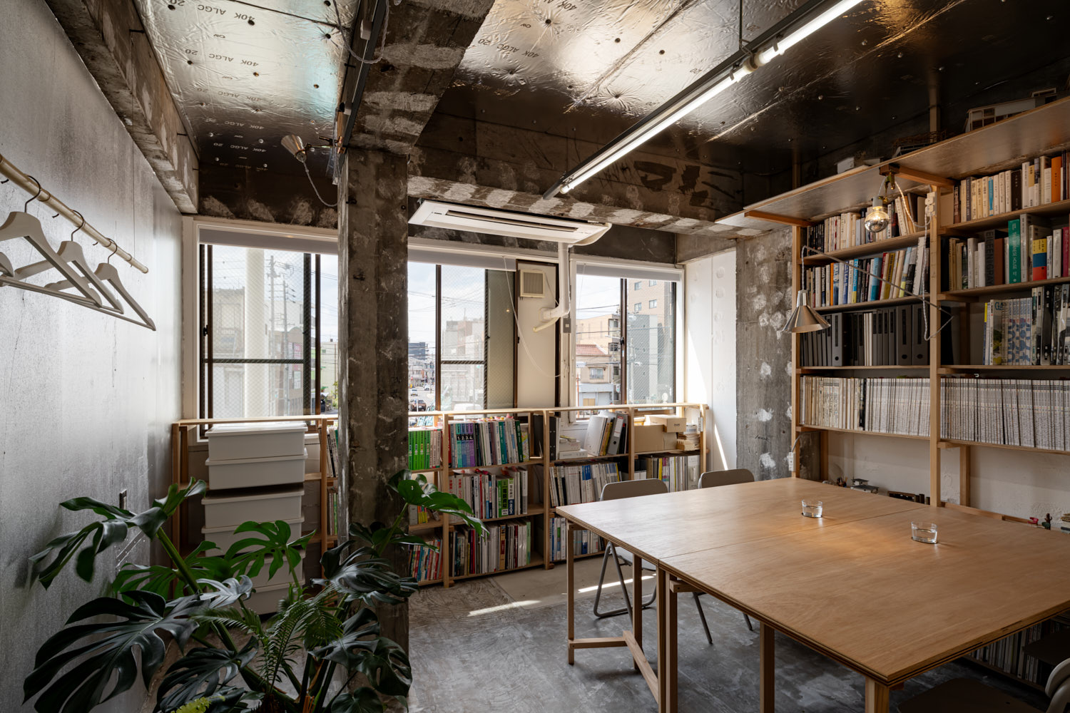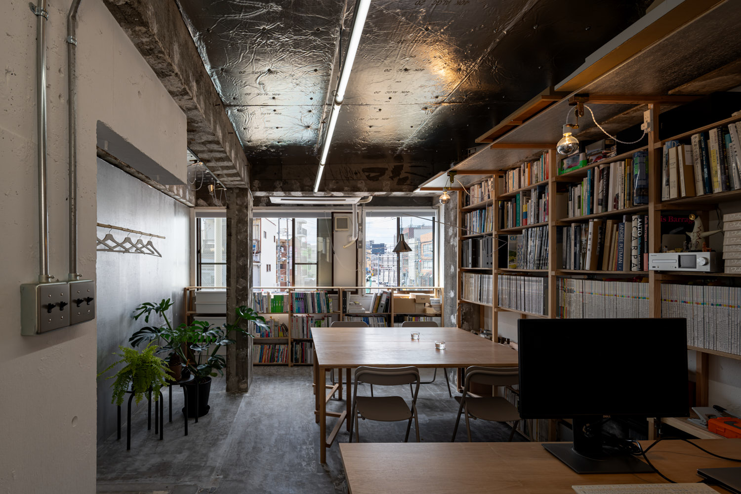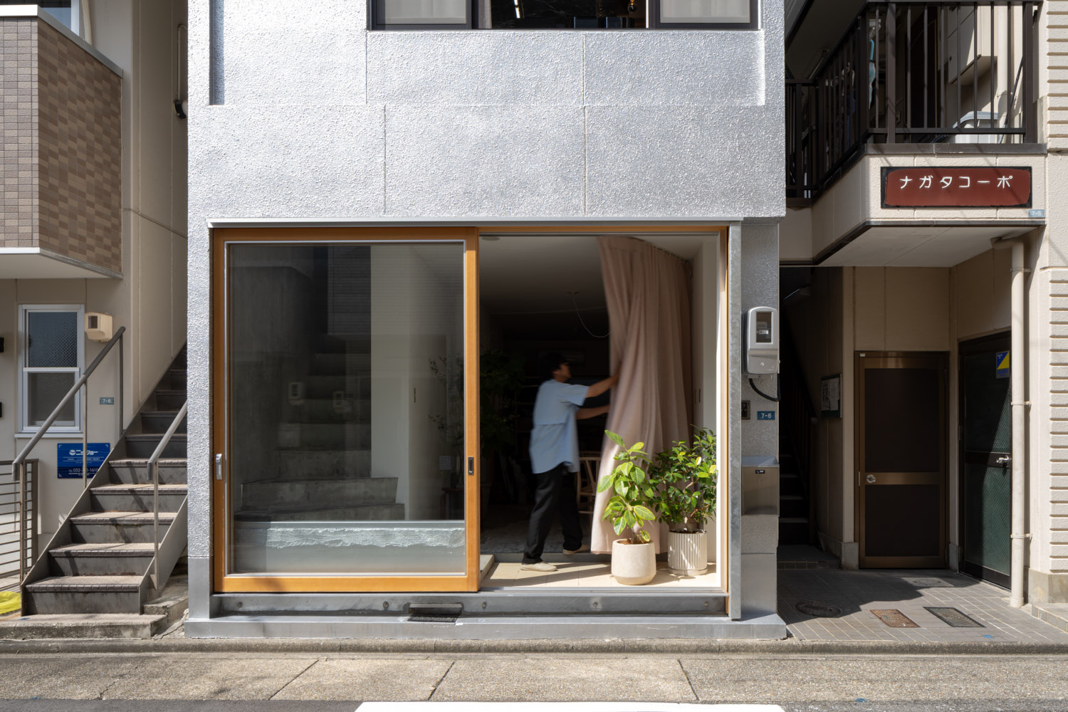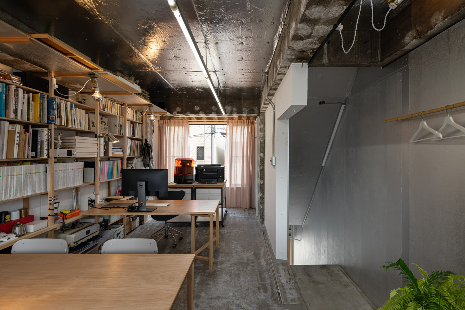 2階には最低限の什器を設えた。安価で汎用性の高い30㎜×40㎜杉胴縁材とラワンベニヤで構成し、既存の構造フレーム、木製フレームの什器、本や資料などの氾濫するモノたちと、その奥に透ける統一性のない既存の外壁の肌理を、雑多な街の風景に並べた。1階には通りに面した空間をくるっと円弧状に包むようにカーテンを掛けて、通りのポケットのような場所をつくった。