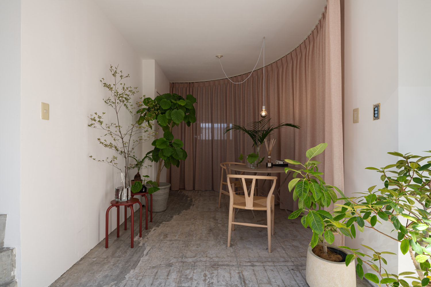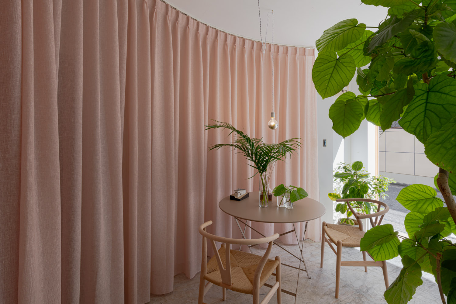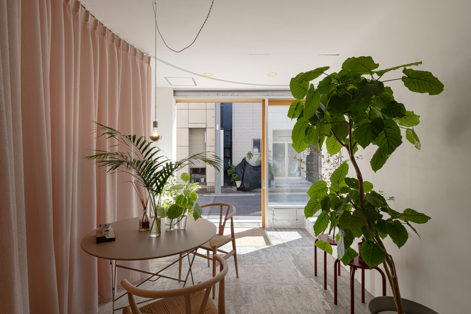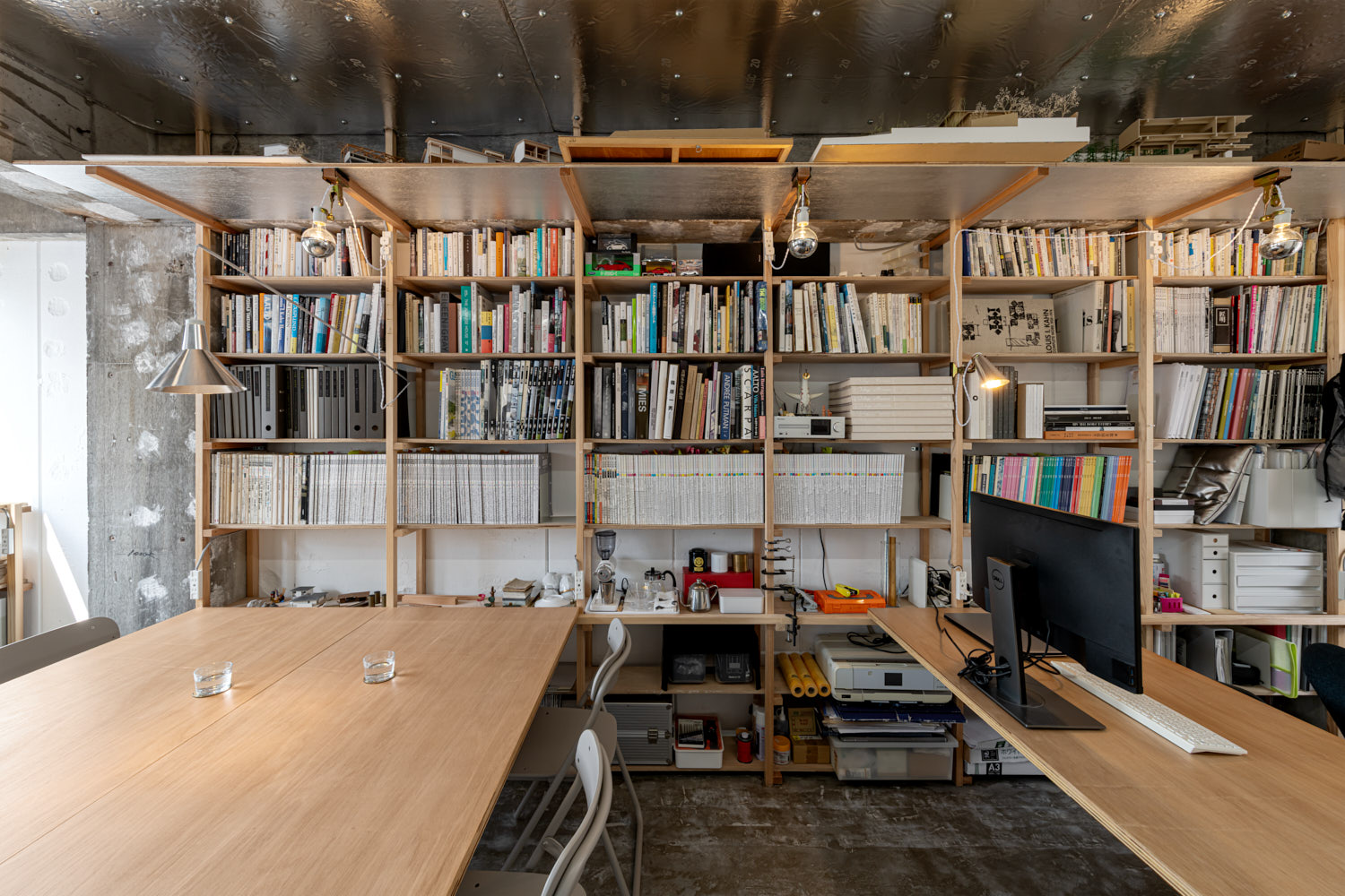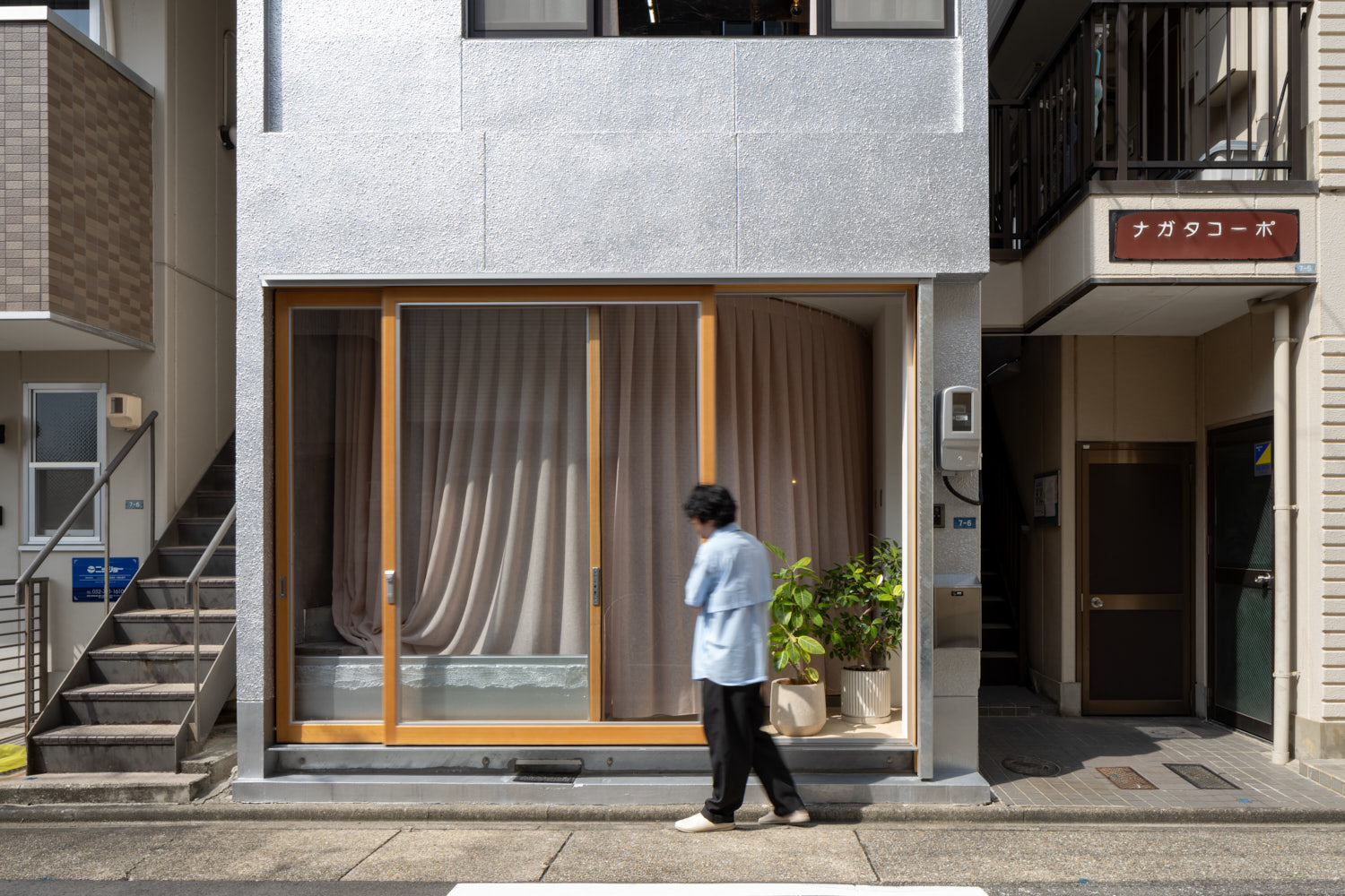 2階には最低限の什器を設えた。安価で汎用性の高い30㎜×40㎜杉胴縁材とラワンベニヤで構成し、既存の構造フレーム、木製フレームの什器、本や資料などの氾濫するモノたちと、その奥に透ける統一性のない既存の外壁の肌理を、雑多な街の風景に並べた。1階には通りに面した空間をくるっと円弧状に包むようにカーテンを掛けて、通りのポケットのような場所をつくった。