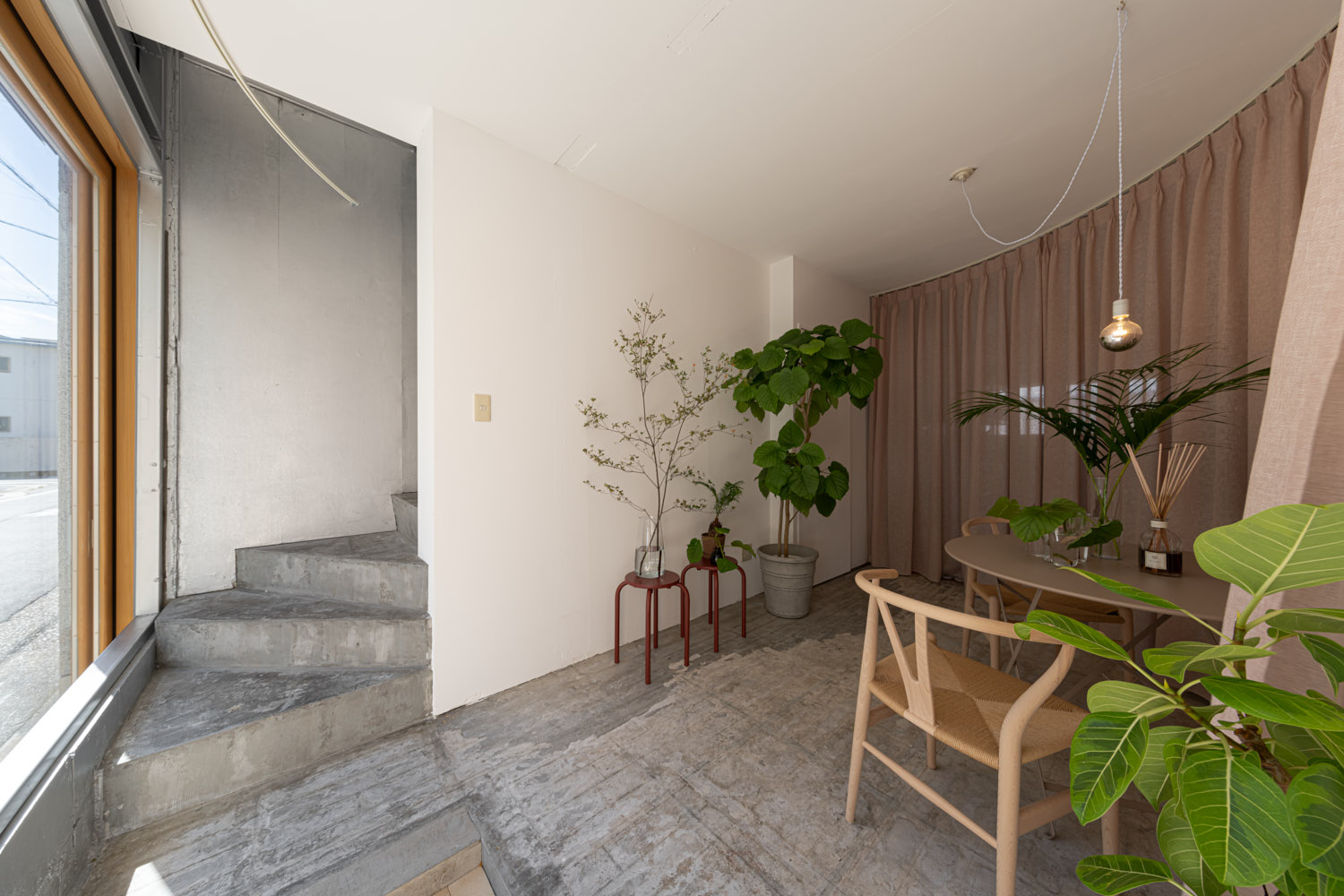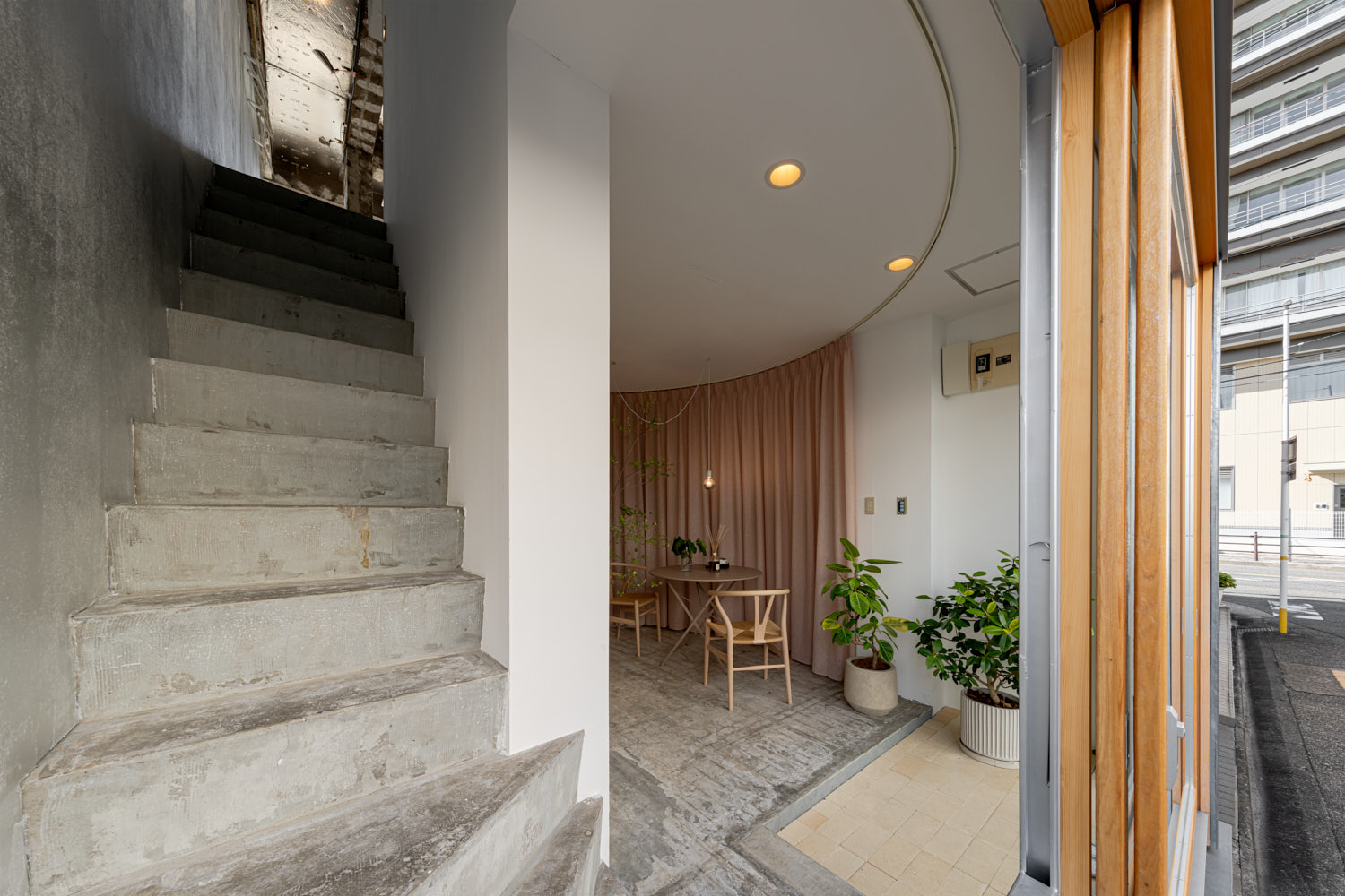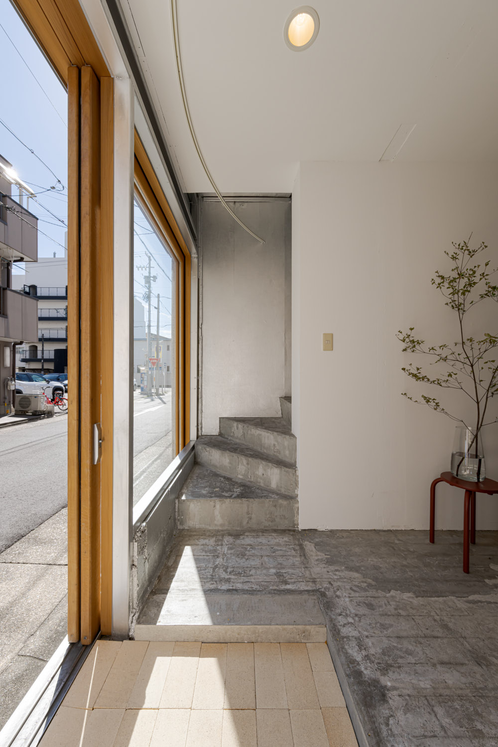 通りに面した1階の乾式の外壁とサッシは撤去して間口一杯を開口にした。2階裏手のサッシはガラスを透明ガラスに交換し、1階の通りから2階裏手の街の風景を階段を通じて視覚的につなげた。