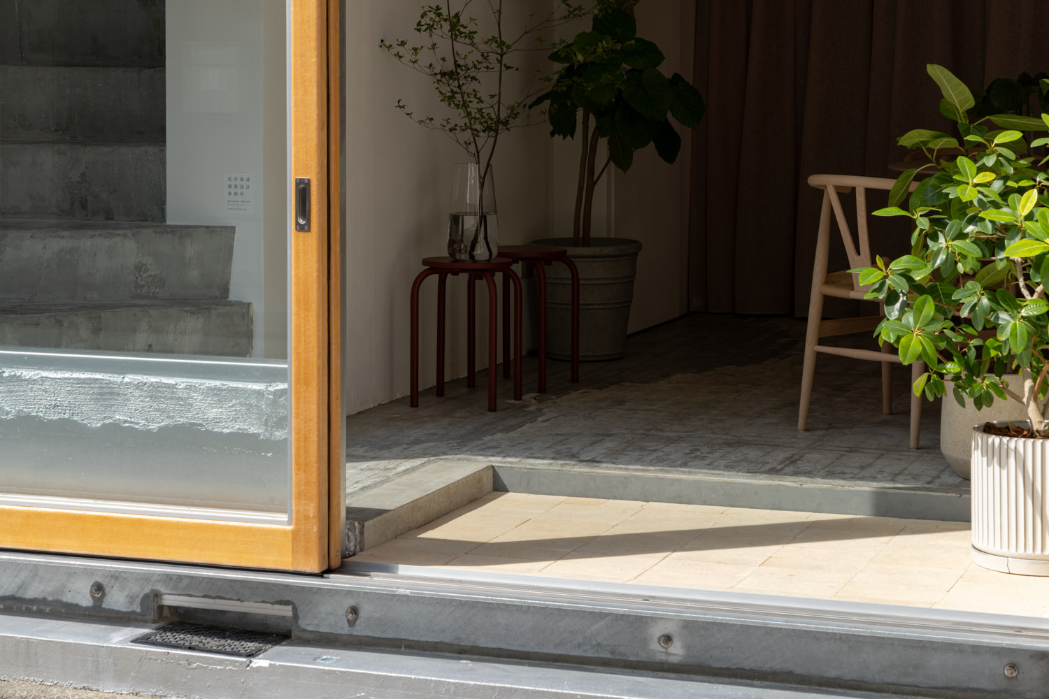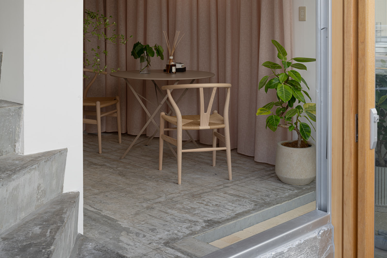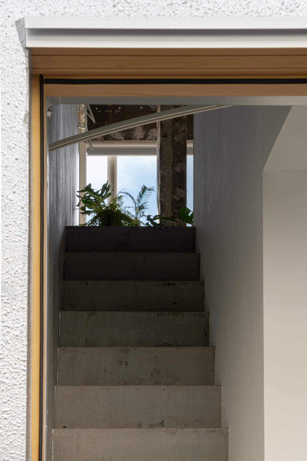 通りに面した1階の乾式の外壁とサッシは撤去して間口一杯を開口にした。2階裏手のサッシはガラスを透明ガラスに交換し、1階の通りから2階裏手の街の風景を階段を通じて視覚的につなげた。